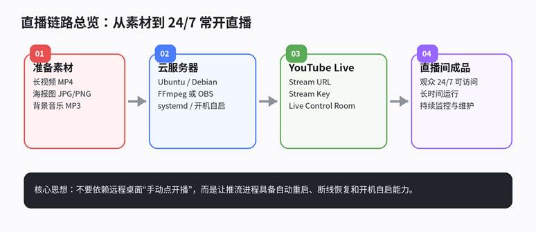 真正的 24/7 无人值守,不是把远程桌面一直挂着、每天手动点“开始直播”,而是把直播做成一条可自动恢复的推流链路:素材上传到云服务器,推流程序长期运行,异常退出后自动拉起,服务器重启后自动恢复。