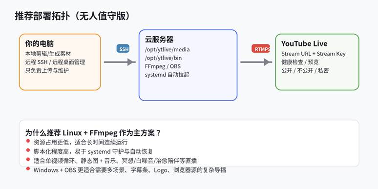 | 提示 | 一句话结论:如果你的直播内容是单视频循环、静态图加背景音乐、白噪音或冥想陪伴,Linux + FFmpeg 几乎总是比“云电脑 + 手动点 OBS”更稳、更省钱。 |