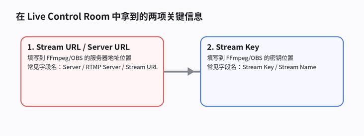 - 把这两项分别填到 FFmpeg 或 OBS 的推流配置中。
