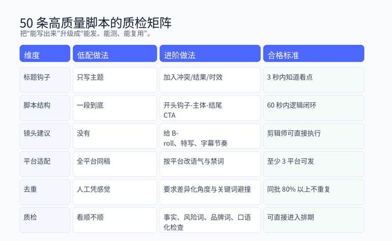 - 同一批脚本必须做差异化:不同切口、不同受众、不同表达场景。