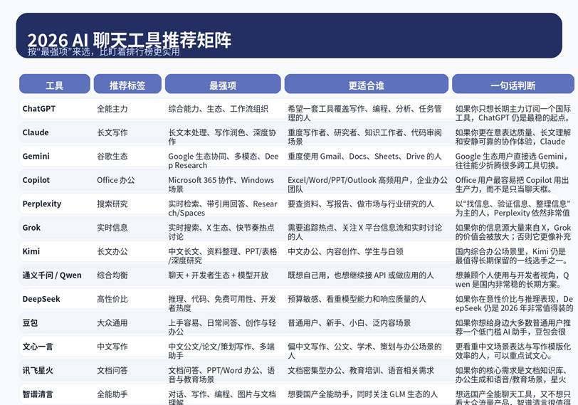 一篇看懂 2026 年最值得长期使用的 AI 聊天工具。本文从综合能力、写作长文、搜索研究、办公生态、中文表现与性价比六个维度,盘点 ChatGPT、Claude、Gemini、Copilot、Perplexity、Grok、Kimi、通义千问、DeepSeek、豆包、文心一言、讯飞星火、智谱清言等 13 款主流产品,给出按场景选择的实用建议。