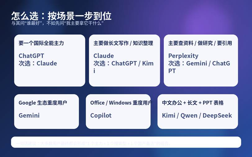 先按现有生态来选,而不是先看排行榜。Microsoft 365 团队优先评估 Copilot,Google Workspace 团队优先评估 Gemini;如果是通用知识工作团队,再把 ChatGPT、Claude、Perplexity 纳入试用。国内团队则建议同时试 Kimi、Qwen、DeepSeek。