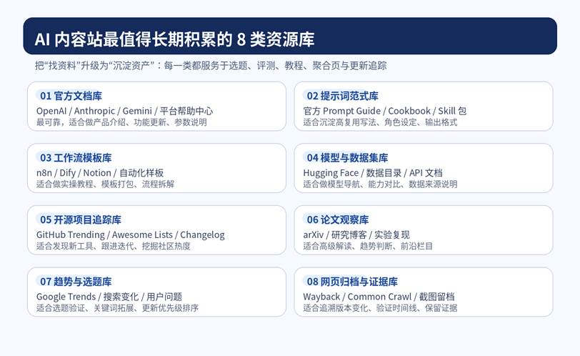如果你的网站还在早期阶段,建议先按优先级建立这四类:官方文档库、工作流模板库、趋势与选题库、开源项目追踪库。前两类负责事实与实操,后两类负责持续发现新内容。等站点有了一定体量,再逐步补强模型与数据集库、论文观察库以及归档证据库。