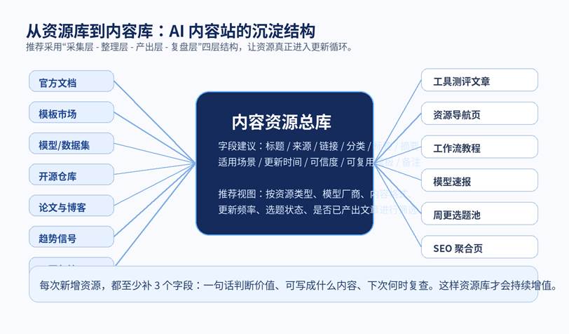对 AI 工具类、工作流类、模型类内容站来说,资源库至少承担四个功能:第一,作为选题雷达,帮助你持续发现值得写的新方向;第二,作为事实底稿,降低介绍产品、对比模型、拆解功能时的信息偏差;第三,作为模板仓库,缩短写教程、做清单、写 SEO 聚合页的准备时间;第四,作为证据留档,帮助你记录版本变化、页面改版与官方口径更新。
