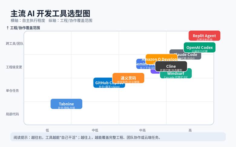 • 不只罗列工具,而是按“补全 → 会话 → 多文件编辑 → 代理式开发”这条能力演进线来整理。