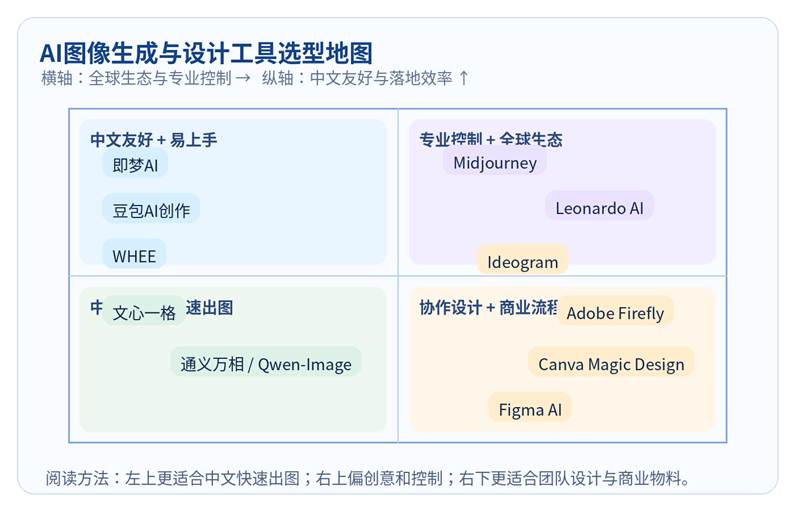 • 中文用户选型时,除了出图质量,更该看中文指令理解、带字海报能力、局部重绘和接入设计软件的顺滑程度。