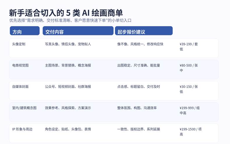 副业初期最怕“范围太大”。你会发现,不同客户对 AI 绘画的预期差异极大:有人想要高点击率封面,有人想要电商主图氛围图,有人想做头像定制,也有人需要 IP 角色与系列海报。对于新手,建议优先选择 1 到 2 个“需求明确、交付标准清晰、修改成本可控”的方向。