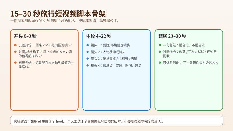 旅行 Shorts 的脚本不该像公众号文章那样铺陈,它更像“镜头顺序 + 口播节奏 + 信息点”的组合。AI 在这里最适合做两件事:一是给你多版本 hook,二是把你脑子里的信息整理成更顺的结构。