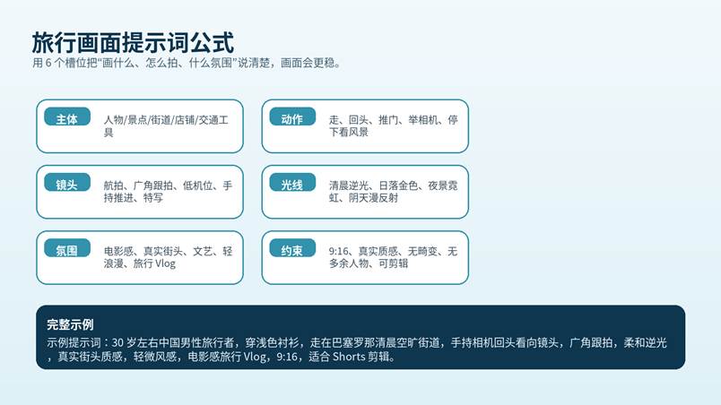 图 3|旅行画面提示词公式:主体、动作、镜头、光线、氛围、约束六个槽位缺一不可。