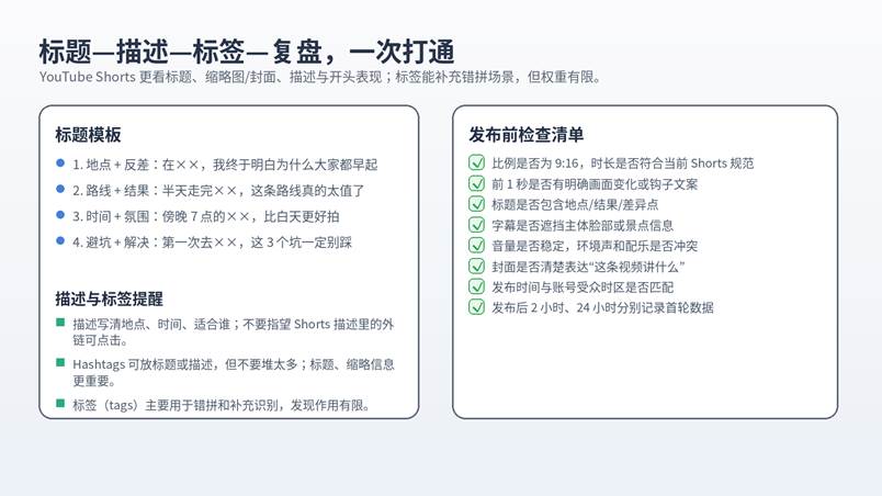 旅行 Shorts 发布环节最容易被忽视,但它其实决定了观众有没有兴趣点进去。你不需要把标题写成新闻,而是要让观众一眼明白:这条视频讲的是哪里、有什么结果、为什么值得看。