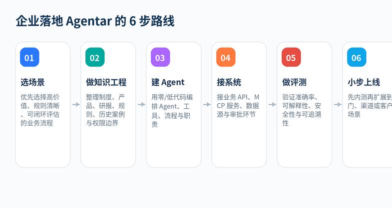 如果你把 Agentar 当成一个企业项目来推进,更合理的顺序通常不是“先选模型”,而是下面这 6 步: