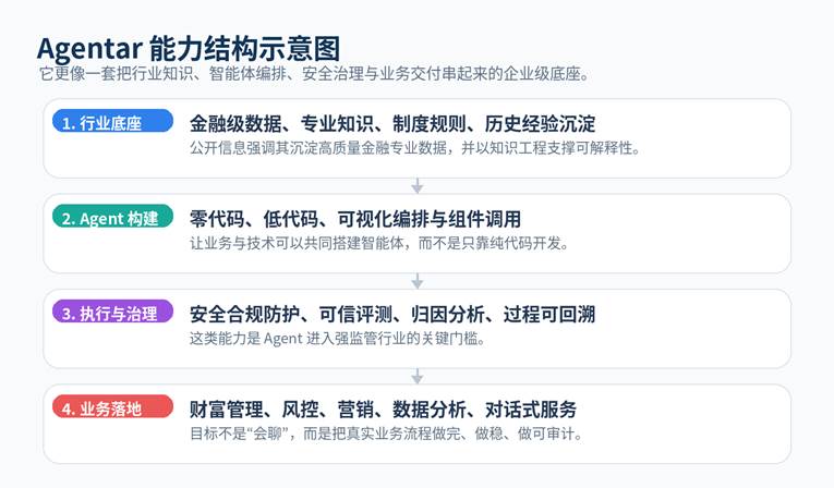 在 2025 年 4 月对外发布时,官方新闻将其描述为面向金融机构的一站式、全栈智能体开发工具,目标是帮助金融机构高效打造能够自主决策、可信可靠的智能体应用。[2] 如果把很多“AI 智能体平台”理解成“让你快速做一个 Bot”,那 Agentar 更像“让企业把一个合规、可审计、可上线的数智员工体系做出来”。