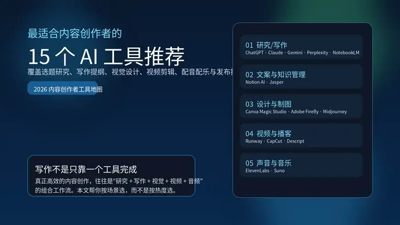 这篇文章不是做一个泛泛的“AI 工具清单”,而是专门站在内容创作者的视角,挑出 15 个真正值得放进工作流里的工具。我们会把它们按内容生产流程拆开来讲:哪些更适合做选题研究,哪些适合长文写作,哪些适合做封面与配图,哪些能明显提升短视频效率,哪些能把你的音频内容做得更像成品。