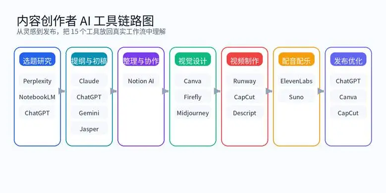 | 先看结论: 如果你只想先搭出一条实用的内容生产链路,优先考虑 ChatGPT / Claude(写)+ Canva(图)+ CapCut(视频);如果你做长文,增加 Perplexity 与 NotebookLM;如果你做短视频或播客,再加入 Runway、Descript、ElevenLabs、Suno。 |
