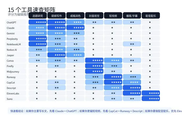下面这张矩阵不是“绝对评分”,而是站在内容创作者的真实工作流视角,给出每个工具最适合介入的环节。你可以把它当成一张“先装什么、后装什么”的导航图。