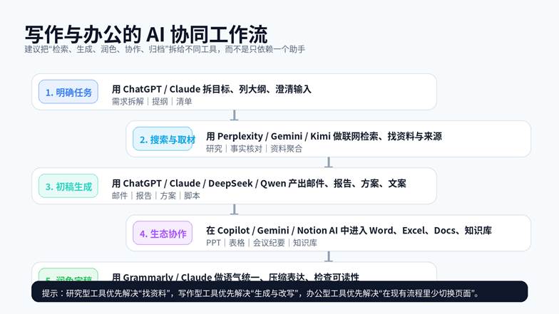 真正高效的做法,不是盯着“哪款工具最强”,而是把不同工具放在最适合的位置。研究型工具负责找资料,生成型工具负责出初稿,办公型工具负责进入既有文档流,润色型工具负责收尾。