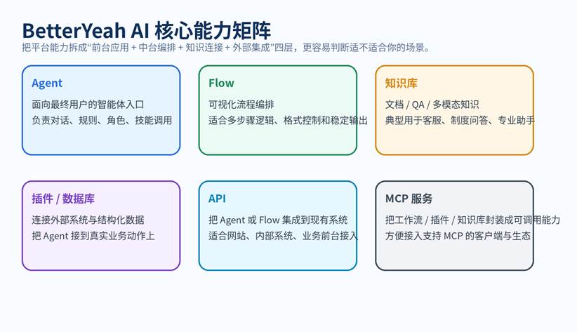 | 先用一句话认识 BetterYeah AI • BetterYeah AI 更像一个面向企业落地的智能体平台,而不是单纯的聊天助手。 • 它把 Agent、Flow、知识库、插件、数据库、API、MCP 等能力放在同一套平台里,便于业务团队与技术团队一起把 AI 接进真实流程。 • 阅读重点:这篇更关注“它适不适合企业落地”,而不是只讲功能清单。 |