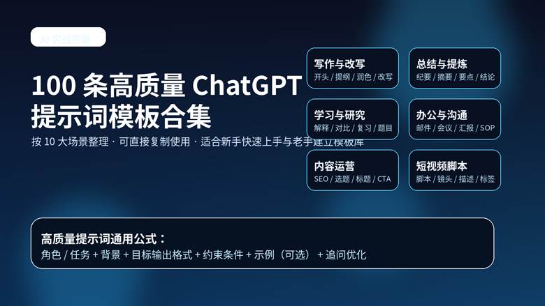 这份文档把 100 条高质量 ChatGPT 提示词模板按 10 大常见场景整理出来,覆盖写作、总结、学习、办公、内容运营、短视频、自媒体、电商、数据分析、编程与个人效率等高频用途。你可以直接复制使用,也可以把它们改造成自己的长期模板库。