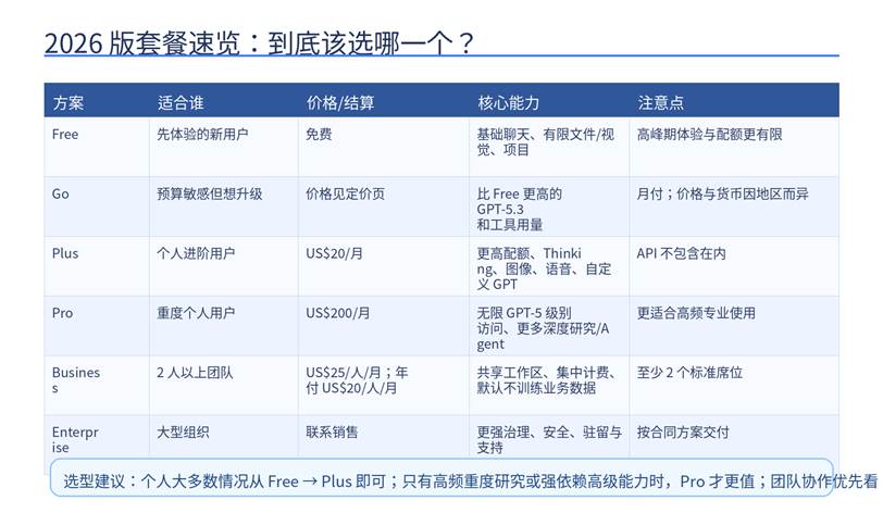 4)提前想清楚自己是“个人订阅”还是“团队开通”。个人使用一般只在 Free、Go、Plus、Pro 之间做选择;而只要涉及统一结算、成员管理、共享空间、企业级隐私,就应该直接看 Business 或 Enterprise。
