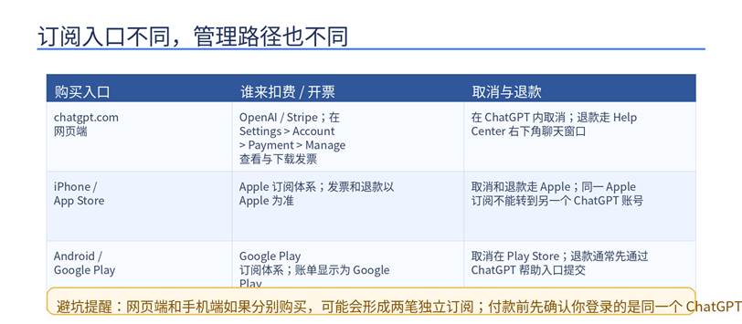 如果你是在 iPhone 上订阅,实际扣费和退款会受 Apple 订阅体系管理;如果你是在 Android 上订阅,则主要走 Google Play。看似都叫“ChatGPT 订阅”,但后台不是同一套收费路径,因此取消、开票、恢复购买和申诉时的处理方式也会不同。