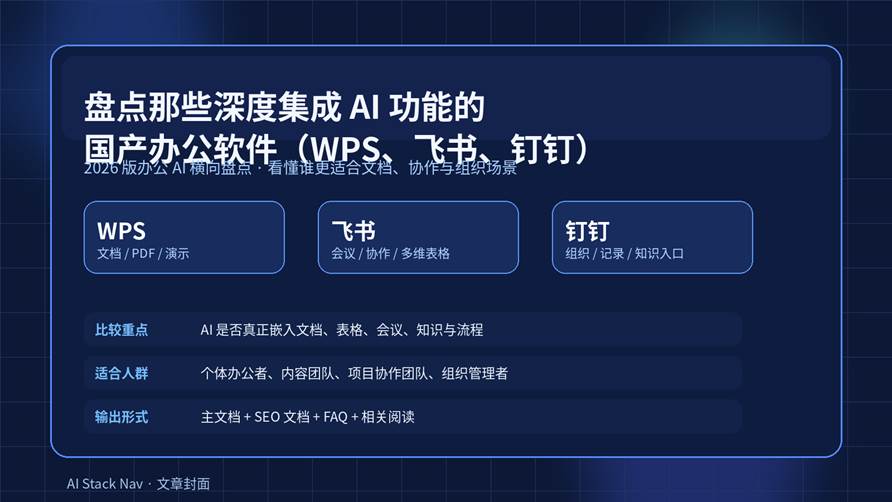一篇面向 2026 年办公场景的国产 AI 办公软件盘点稿,重点横向比较 WPS、飞书、钉钉在文档写作、表格与业务系统、会议纪要、知识问答、协作闭环和上手门槛等方面的差异,帮助个人用户与团队快速判断该优先选择哪一套 AI 办公入口。