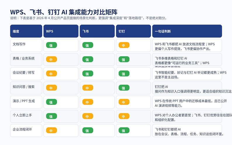 A:不能脱离场景回答。单看聊天或写作能力意义不大,真正该比较的是:它能不能在你常用的工作流里自然接手下一步。对文档重度用户,WPS 更有优势;对协作闭环,飞书更完整;对组织入口和知识问答,钉钉更突出。