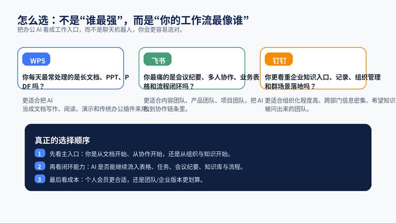 所以,这三家并不是在争同一个位置。WPS 更像“个人办公提效器”,飞书更像“协作与业务系统加速器”,钉钉更像“组织级 AI 工作入口”。真正重要的,不是绝对排名,而是你的工作流最像谁。