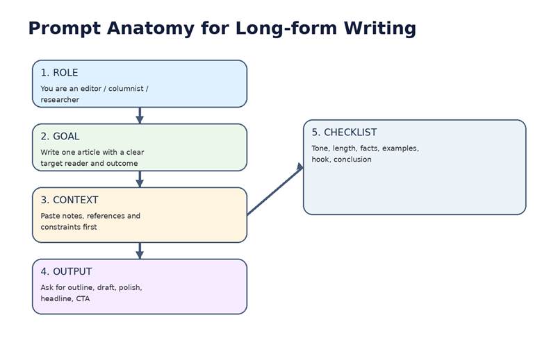 图 1  长文提示词的最小骨架:Role – Goal – Context – Output – Checklist