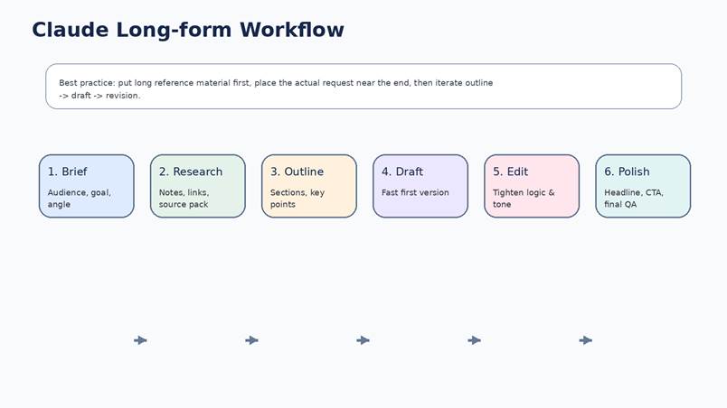 真正好用的长文流程,通常不是“把主题丢进去 – 等全文出来”,而是先做 brief,确认读者、目标和角度;再做 research,把采访、链接、数据、案例整理成 source pack;接着只让 Claude 产出 outline;等结构稳定后再进入 fast draft;然后用 edit 模板清理逻辑、冗词和节奏;最后再 polish 标题、摘要与 CTA。