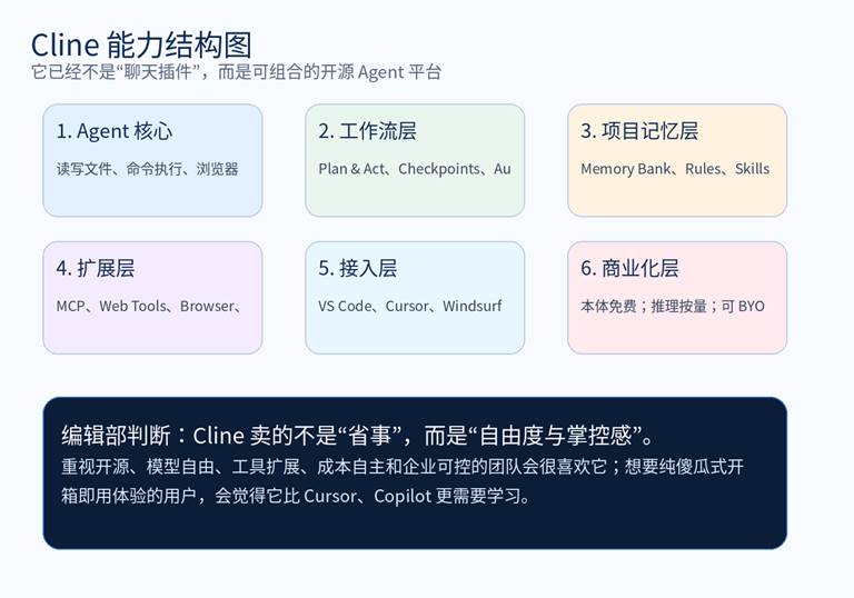 如果你把 Cline 当作“又一个会补全代码的插件”,你会低估它;如果你把它看成“开源 Agent 底盘 + 多模型路由层 + 可扩展工作流系统”,你就更容易理解它为什么在 2026 年依然有很强的存在感。