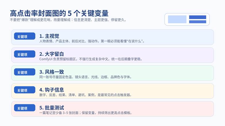 很多人批量做图失败,是因为只在换提示词,没有换“封面结构”。真正决定点击率的,是你是否把封面拆成可控变量。