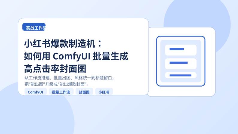 很多人一开始就想用 ComfyUI 一键批量出 100 张封面图,但真正有价值的,是先做出 1 套能稳定复用的模板。因为只有模板稳定,你的标题、品牌感、选题风格和点击预期才会稳定。
