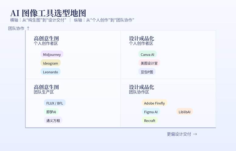 图 1|按“创意生图 / 设计交付 / 个人创作 / 团队协作”四个象限看工具位置