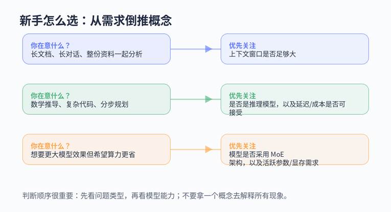 所以你以后看到模型介绍时,先不要急着被名词带着走。先问:我的任务到底需要更长输入、更强复杂推理,还是更省算力的大模型结构。问题一旦问对,选型就会简单很多。