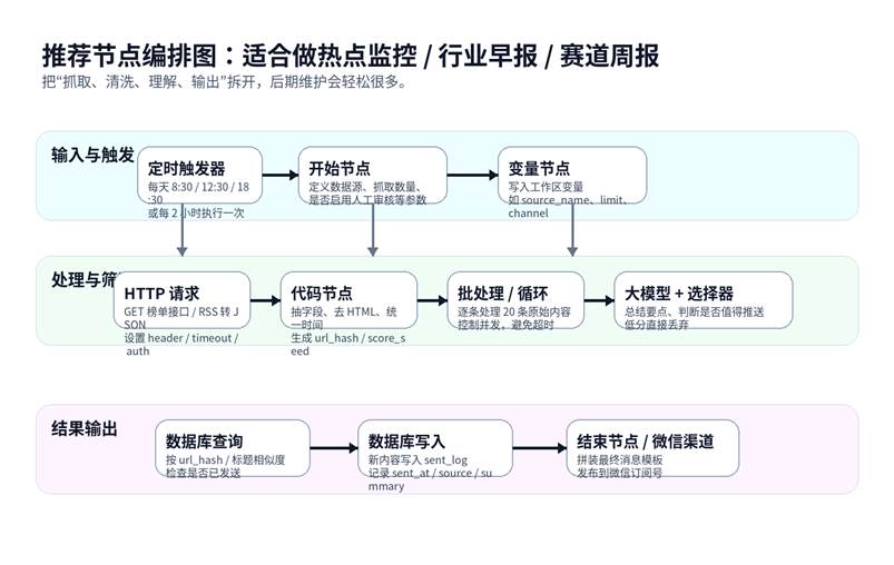 图 2:推荐的节点编排图,把输入触发、处理筛选、结果输出三层拆开