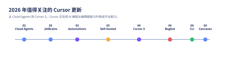 | 2026-03 | Cursor in JetBrains IDEs | 通过 ACP 进入 IntelliJ IDEA、PyCharm、WebStorm 等生态 |