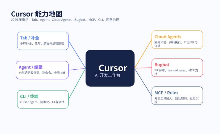 - 2026 年的 Cursor 已明显从个人生产力工具,升级为支持多环境并行 Agent、团队规则沉淀、自动化触发和企业管控的平台型产品。