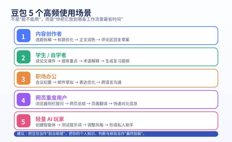 真正高效的用法,不是把豆包当作“最后裁判”,而是把它当成“前台助理”。前台负责起草、整理、提炼与提示风险;真正拍板的人,仍然应该是你自己。