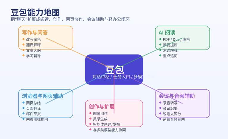 豆包 AI 助手功能解析封面图,展示写作、阅读、网页辅助与会议记录等能力