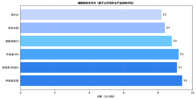 综合评分:8.9 / 10。ElevenLabs 在声音真实感、模型选择、开发者 API、出海本地化和语音 Agent 方向都处于一线水平;扣分点主要在于积分/模型成本需要仔细核算,声音克隆涉及合规门槛,中文生态和本地短视频链路不一定比国内工具顺手。