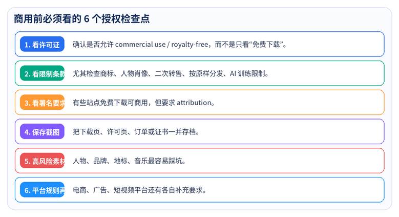 - 误区 2:写着 royalty-free 就绝对安全。它通常只是“不按次收版税”,并不自动覆盖商标、肖像、地标、音乐版权等问题。