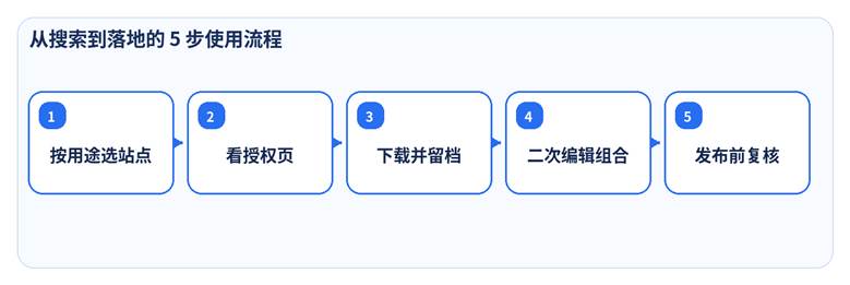 真正高效的素材工作流,不是“哪里都搜一点”,而是先搭出一套可复用的资源系统:知道什么场景去哪找、知道下载前看什么、知道发布前再核对什么。这样你以后做公众号、短视频、PPT、电商详情页和网站内容时,速度会越来越快,风险也会越来越低。