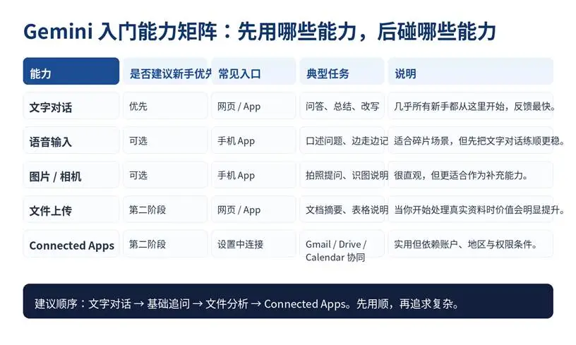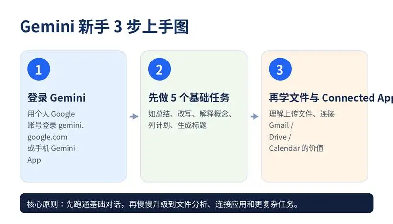 第 1 阶段:网页端文字对话、追问、改写、总结。第 2 阶段:文件上传与文档分析。第 3 阶段:Connected Apps 与 Google 生态协同。第 4 阶段:根据你的工作流,再去了解模型切换、计划升级与更进阶功能。