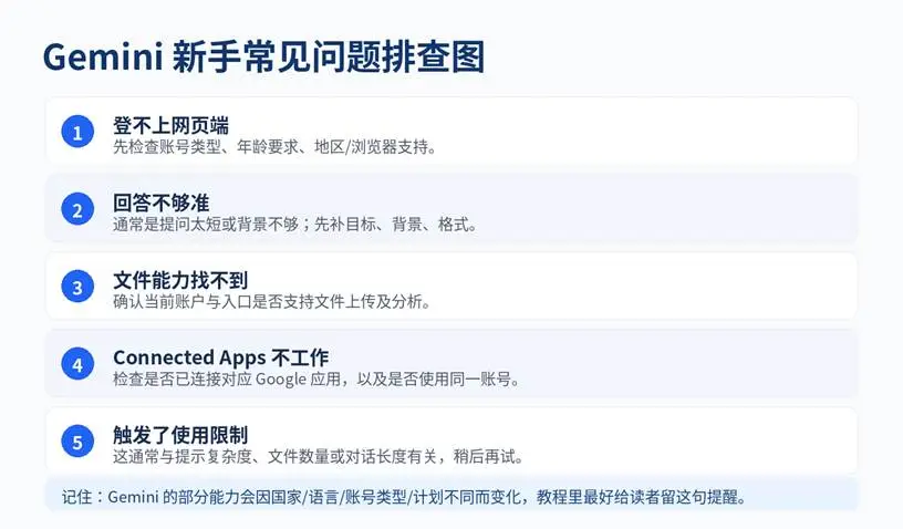对新手来说,最稳的策略始终是:先从网页端基础对话开始,先做最容易成功的小任务,再慢慢接触文件、Connected Apps 和更复杂场景。这样不但更容易获得成就感,也更容易判断 Gemini 适不适合进入你的长期工作流。