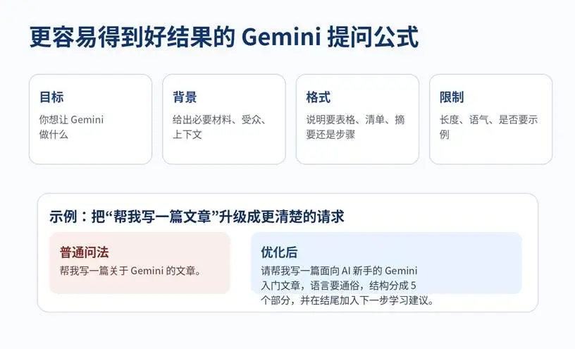 很多人觉得 AI 不够好用,问题往往并不在模型本身,而在提问太短、背景太少、目标不清。对于 Gemini 也是一样。你如果只说“帮我写一篇文章”,它当然可以写,但结果往往不稳定,因为你没有说明写给谁、希望什么语气、用什么结构、写多长。