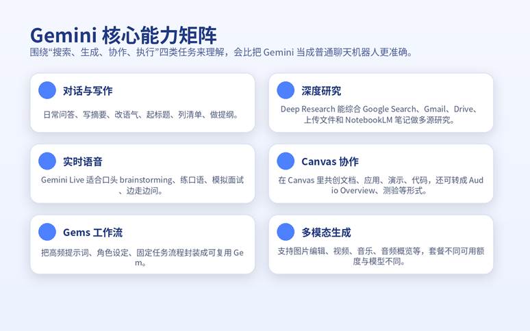 Gemini 是 Google 的 AI 助手,但它早已不只是聊天机器人。本文从 Deep Research、Gemini Live、Canvas、Gems、文件分析、Google Workspace 协同与 Google AI 套餐等维度,系统解析 Gemini 到底适合谁、能做什么、如何更高效地用。