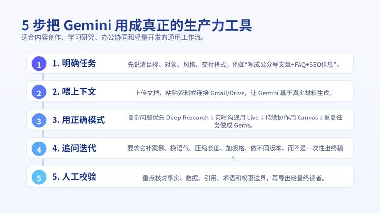 图 2:先定义任务,再补上下文、选正确模式、追问迭代,最后再人工校验,是用好 Gemini 的更稳方法。