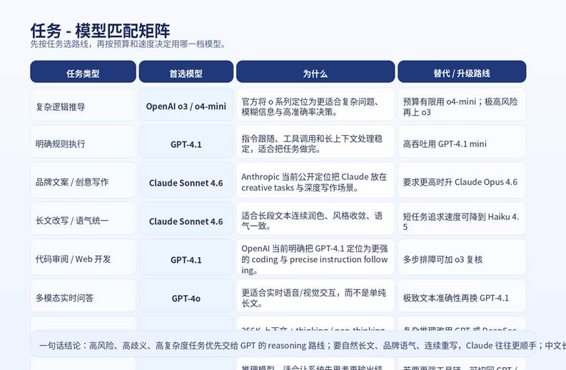 - 规则明确、要求落地、要结构化交付的任务:优先 GPT-4.1。