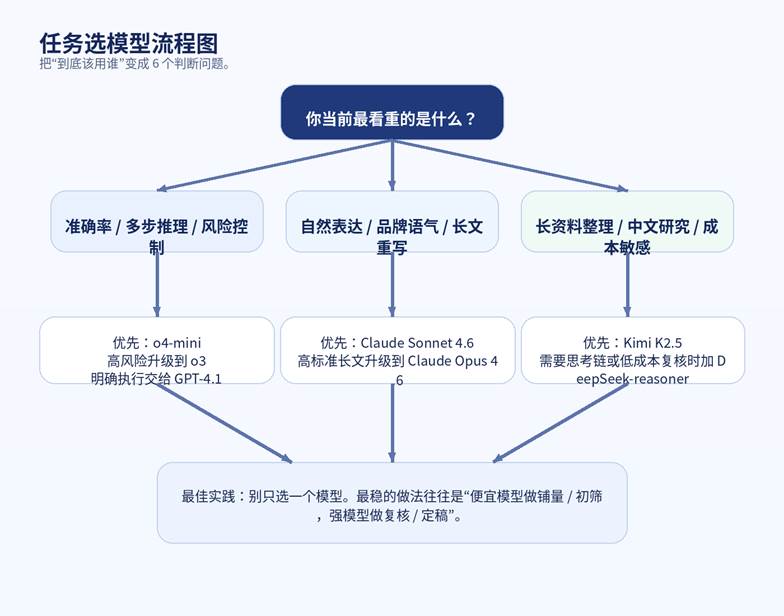 一个很通用的组合是:便宜模型负责铺量和初筛,强模型负责复核和定稿。比如 50 条短视频脚本先让 GPT-4.1 mini 或 Claude Haiku 4.5 批量出,再把点击率更高的候选交给 Claude Sonnet 做风格强化;又比如先用 Kimi 整理 20 万字资料,再让 GPT 的 reasoning 模型判断其中真正值得采纳的结论。