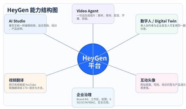 HeyGen 本质上是一套“以数字人为核心的视频生产系统”。对个人创作者,它提供 AI Studio、Digital Twin、Photo Avatar、Stock Avatar、视频翻译等能力;对团队与企业,它进一步叠加 Brand Kit、Workspace、评论协作、权限控制、SSO/SCIM/RBAC、安全合规和 API 集成。随着 2025 年公开上线 Video Agent、2026 年推出 Avatar 3.0 与 Avatar V,HeyGen 的定位已经从“头像视频工具”明显上移到“企业级 AI 视频平台”。